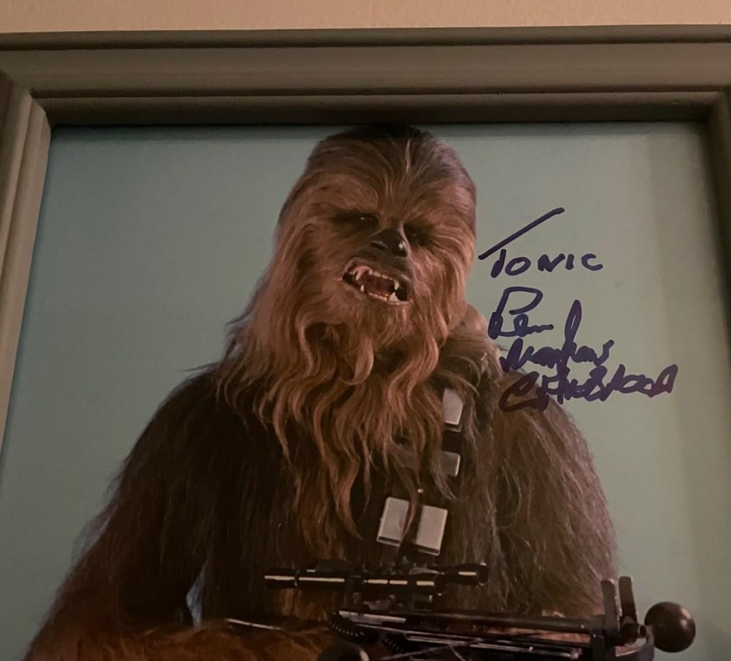 What is it about the Star Wars universe that has brought so many of us adult children together? For me it provided a coping mechanism much needed after years of abuse, rape and beatings. There are moments in every Star Wars movie that bring me to tears. I have grieved when actors from the franchise have passed. I was so fortunate to have been able to design a special challenge coin for the Peter Mayhew Foundation at Peter’s request, and was so excited when he sent me a signed photograph for helping the foundation. I was also so happy to have interviewed David Prowse for a radio station I worked at, and again was given a signed photo. Their characters were so important to me in my day to day imaginary adventures I went on from an eight year old victim to adult survivor.